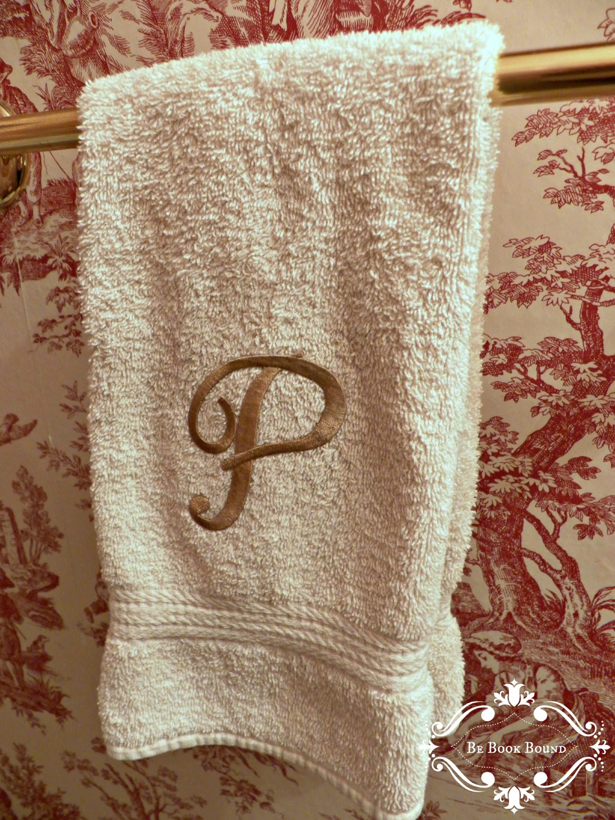 And as the finishing touch to my Pride and Prejudice-inspired powder room, I hung this monogrammed towel on the rack. Yes, it does happen to be the letter of our last name, but I like to think that the "P" stands for "Pemberley"!
